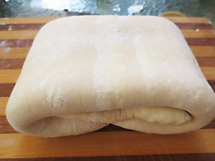 Затем вновь раскатать и вновь сложить конвертиком, поставить в холодильник на 4 часа. И вновь раскатать, свернуть конвертиком и положить в холодильник на 4 часа