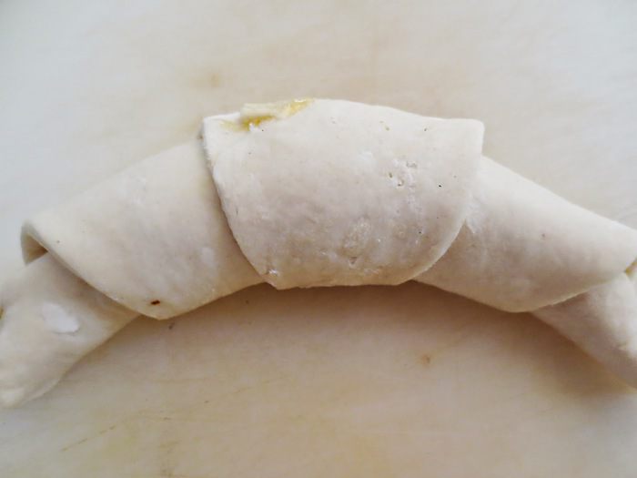 Закрутить. Противень застелить бумагой для выпечки и выложить круассаны Оставить на 1 час, круассаны должны увеличиться вдвое