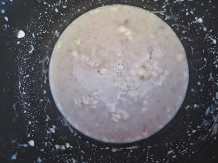 Развести дрожжи в теплом молоке, добавить сахар, соль, 3/4 муки. Перемешать, накрыть пленкой и оставить на 10 минут.