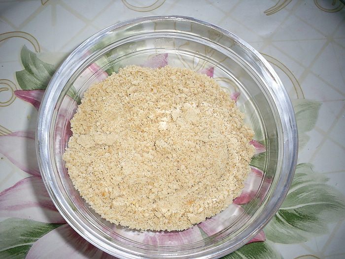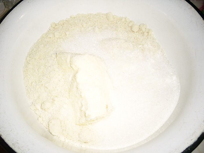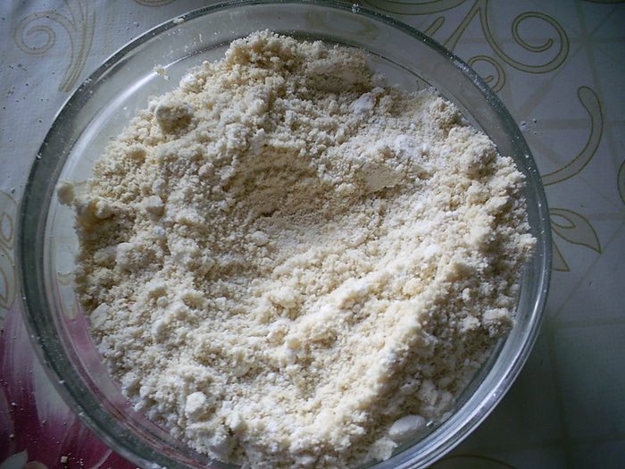 Приготовим крамбл. Мне лично было совсем непривычно делать такую крохотную порцию теста. Все ингредиенты для крамбла (масло должно быть комнатной температуры) помещаем в небольшую мисочку...