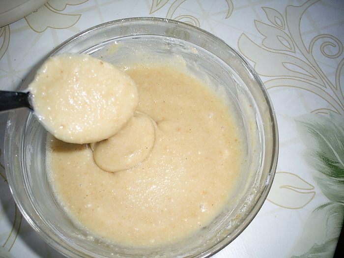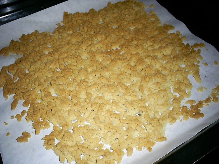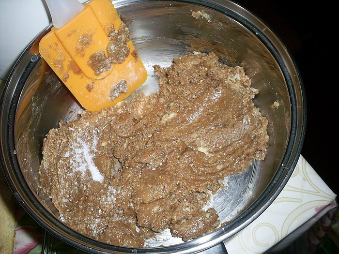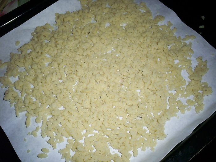 К полученной массе добавляем рубленный миндаль, крамбл (его я растирала в руках) и растопленное масло. Вымешиваем до получения однородной массы.