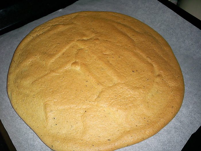 Выпекаем в разогретой до 160 градусов духовке примерно 10 минут или до насыщенного золотистого цвета. Даем остыть. Если собирать торт будете на следующий день, заверните бисквит в пищевую пленку.