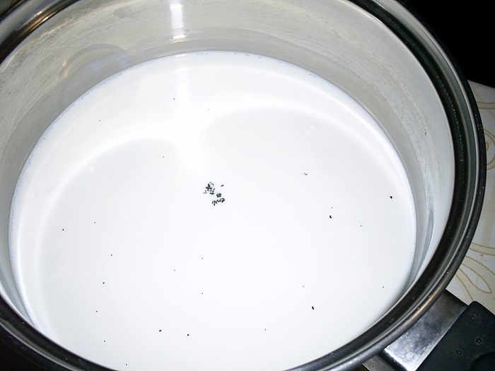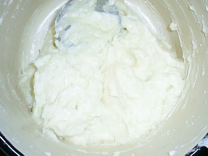 Параллельно растиранию желтков на плите доводим до кипения сливки с семенами ванили и ванилином.