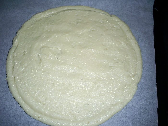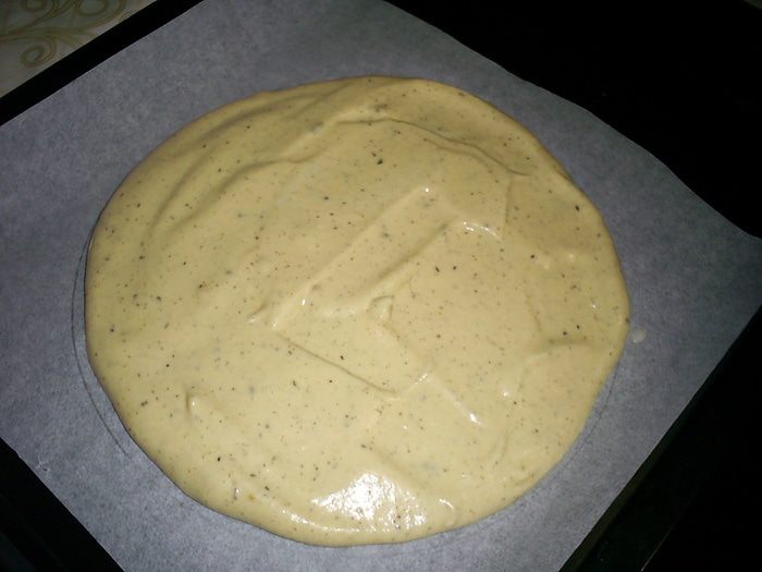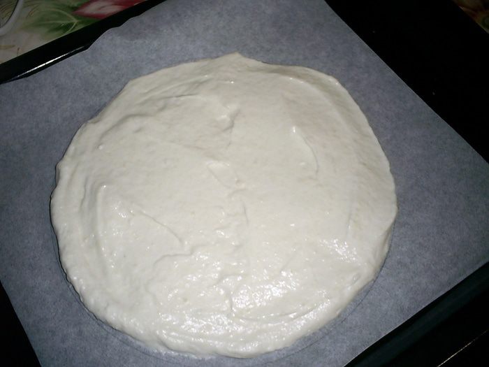 Равномерно распределяем тесто на пергаменте по кругу диаметром 20 см. При выпечке бисквит сначала сильно поднимется, затем опадет. Сохраняем спокойствие.