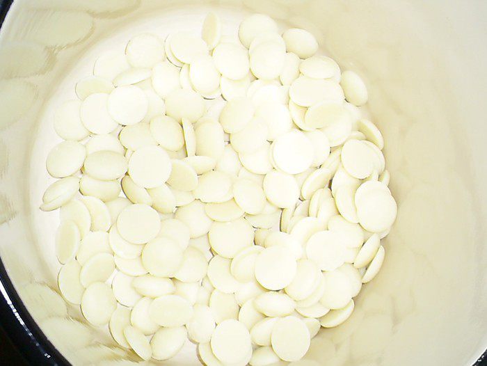 Пришло время для ванильного ганаша. Шоколад поломать на мелкие кусочки и слегка подогреть. Поместить его в глубокую емкость, подходящую для взбивания погружным блендером. Именно так мы и будем готовить ганаш.