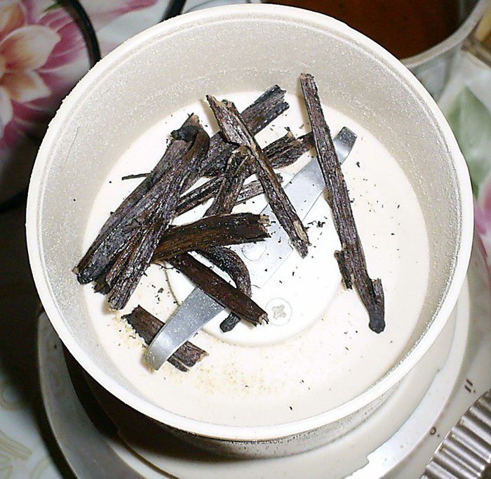 Теперь сухие стручки сложим в кофемолку и смелем до порошкообразного состояния. Там, где в рецепте указаны стручки ванили - это заранее подготовленный порошок из высушенных стручков. Порошок сложить в маленькую сухую емкость, накрыть пищевой пленкой и оставить до востребования.