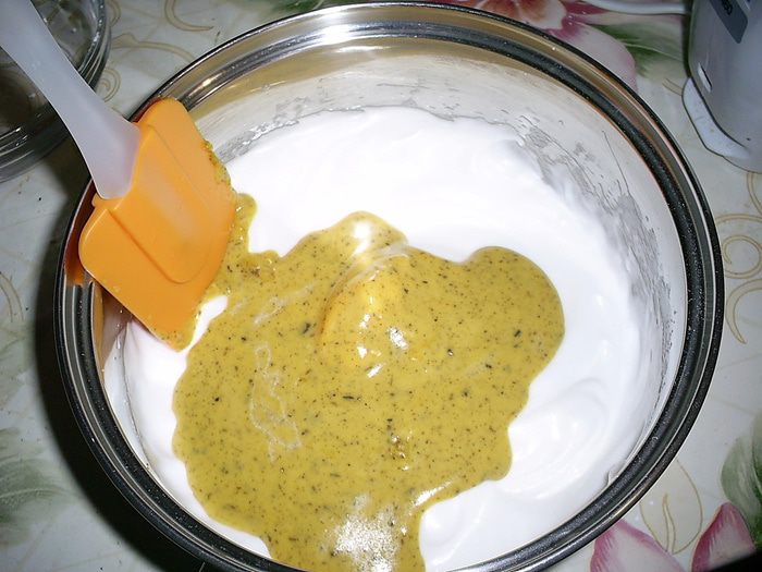 Теперь высыпаем сухую смесь на взбитые белки и аккуратно вымешиваем лопаткой. Тесто получается очень густое и вязкое.