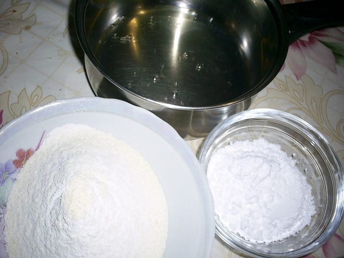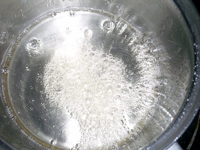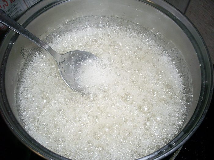 В ковшике на 1,5 литра смешиваем сахар, воду и глюкозу. Ставим на огонь чуть больше среднего и доводим до кипения.