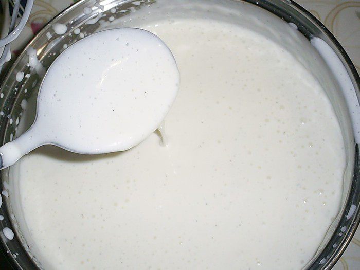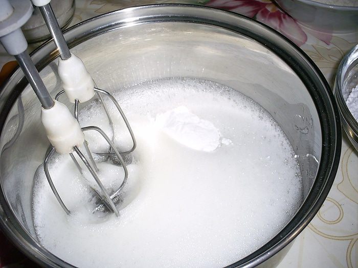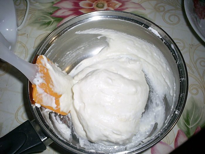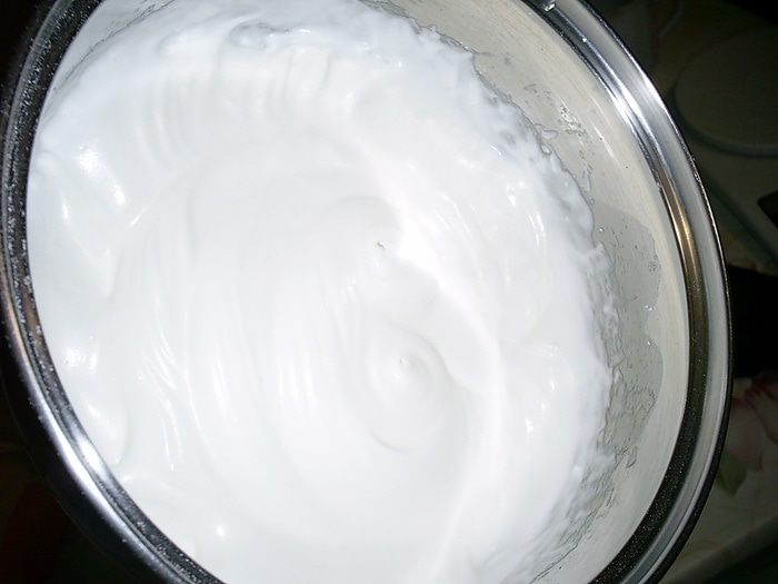 Теперь нам надо подержать крем на холоде, пока он не начнет застывать. Как только вы заметите, что крем начинает желироваться - его надо взбить миксером до однородного пышного состояния. Он останется жидким, но станет насыщенным пузырьками воздуха.