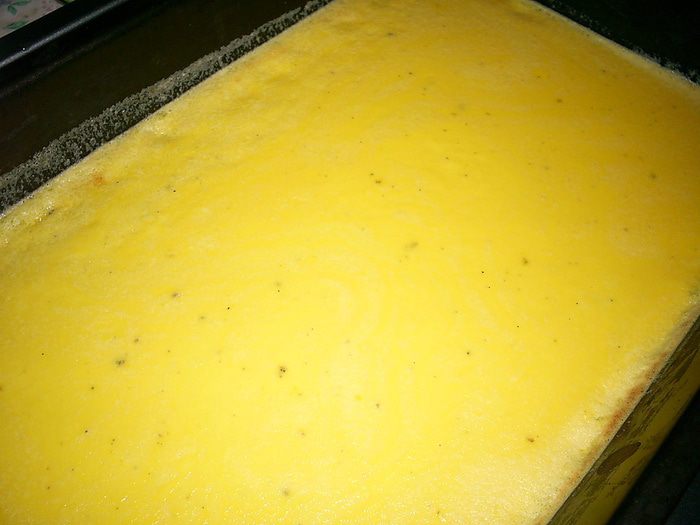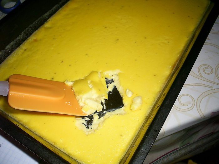В желтки с сахаром тонкой струйкой вливаем кипящие сливки и постоянно помешиваем. Переливаем полученную массу в противень 25*30.