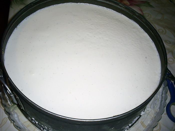Заливаем все кремом и немедленно (!) отправляем в морозилку для застывания крема. Чтоб крем не вытекал снизу, проследите, чтобы блюдо, на котором лежит торт, было идеально плоским, а кольцо плотно к нему прилегало. В целях дополнительной безопасности снизу вокруг кольца можно проложить слой фольги или пищевой пленки.