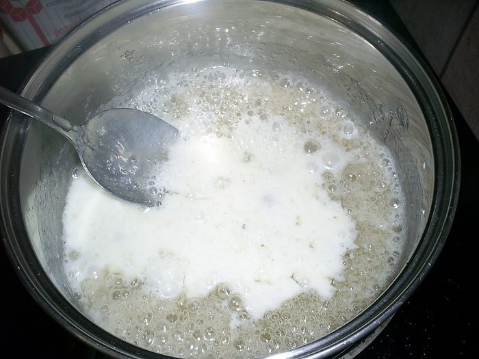 Пока вариться карамель, сливки с ванилином и семенами ванили доводим до кипения. Снимаем карамель с огня. Сразу же небольшими порциями вливаем в нее горячие сливки и перемешиваем до однородности. Будьте очень осторожны - масса поначалу сильно шипит и бурлит.