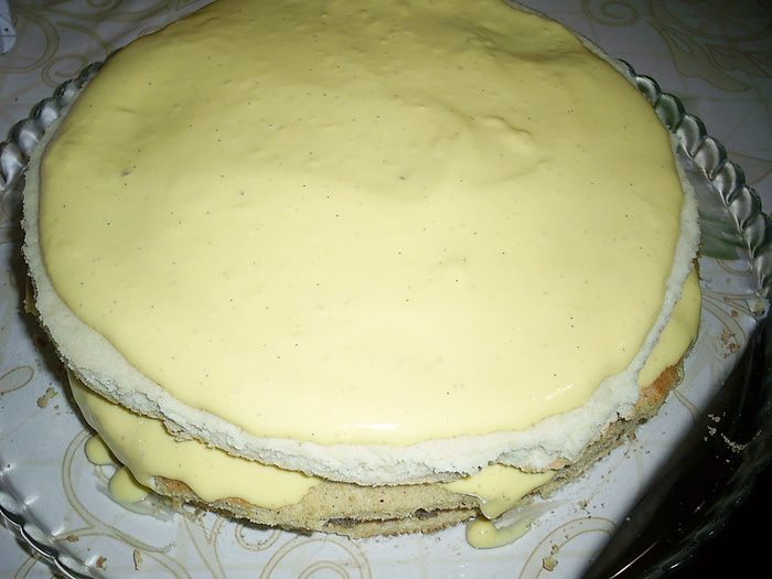 По нему равномерно распределяем половину крем-брюлле и накрываем бисквитом "Ванильный макарон".