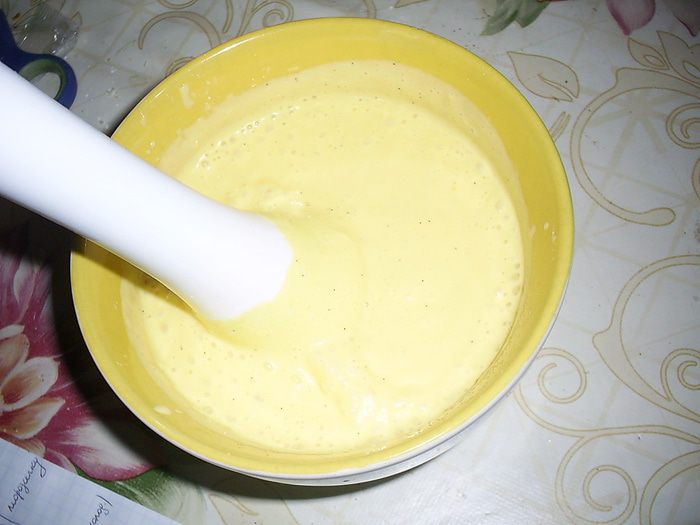 Полученное крем-брюлле остудить и переложить в емкость, в которой его можно будет взбить погружным блендером.