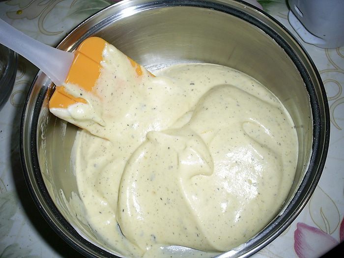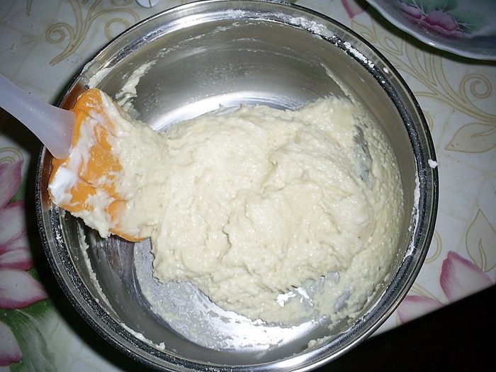 Перемешиваем лопаткой движениями сверху-вниз и от центра к краю. Тесто очень воздушное и довольно жидкое.