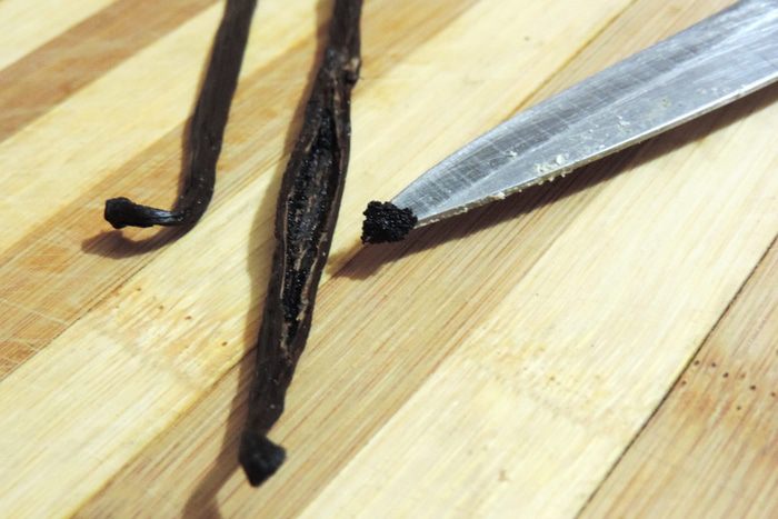 Сначала займемся ванильными стручками. Разрежем их вдоль и тупой стороной ножа аккуратно выскребем семена. Семена сложим в маленькую емкость и накроем пищевой пленкой. Их мы будем использовать далее. Так что, там где в рецепте указаны семена ванили - это они, уже подготовленные. Сами же стручки высушим при 170 градусах в духовке до ломкого состояния. Почаще заглядывайте в духовку и не дайте им сгореть. Время может быть разным. У меня на высушивание ушло примерно 15 минут.