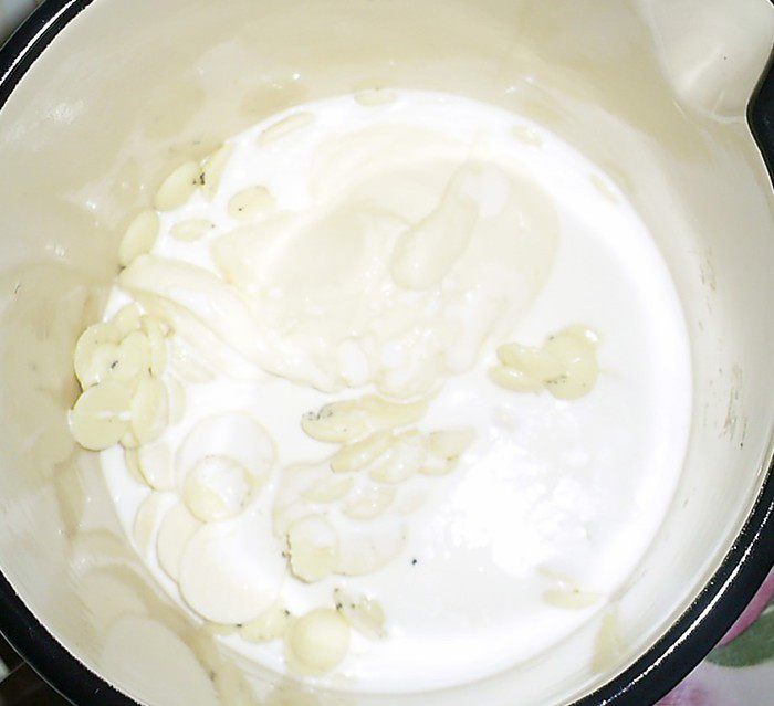 Сливки с сахаром, ванилином и семенами ванили доводим до кипения. Даем им немного остыть и вводим набухший желатин. Тщательно перемешиваем до его полного растворения.