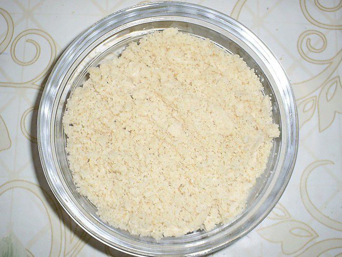 Приступим к приготовлению миндальной пасты. Оставшиеся 50г чищенного миндаля смолоть в кофемолке в муку.