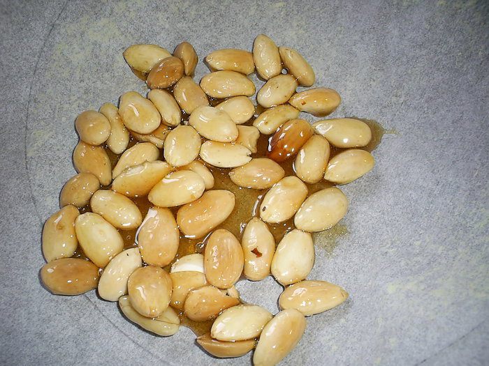 Высыпаем 50г очищенного миндаля в карамель. Перемешиваем и равномерно распределяем по пергаменту.