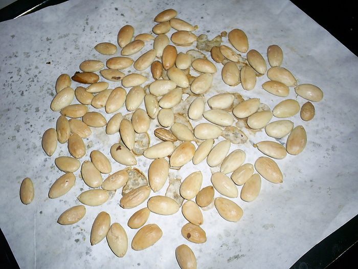 Теперь займемся миндалем. Все 150 граммов миндаля залить кипятком, через пять минут воду слить. Миндаль очистить от кожицы. Сушить на противне с бумагой при 150 градусах до легкого кремового цвета. 50г очищенного миндаля пойдет в мидальную пасту, 50г в пралине и 20г в кранч. Если что-то останется - можно просто скушать в награду за труды. Так что там, где в рецепте указан миндаль, - это из того количества, которое мы сейчас подготовим.