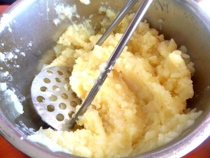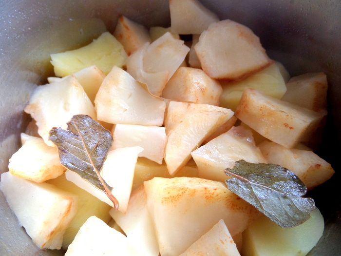 Вытащить лаврушку и сразу начинать мять пюре!