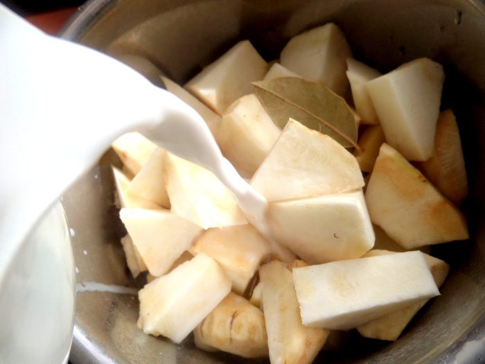 Выложить овощи в кастрюлю с солью и лаврушкой и залить молоком пополам с водой.