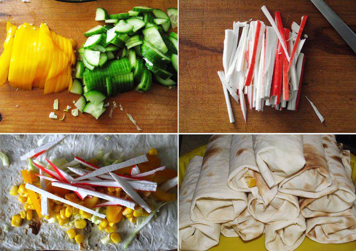 Нарезаем овощи соломкой, крабовые палочки тонкими полосками. Травку промыть и просушить. Лаваш разрезаем на 4 части. Сбрызнуть оливковым или растительным маслом, выложить овощи слоями, добавить немного кукурузы, соль и перец по вкусу, травку, а в конце несколько капель масла и сока лимона. Завернуть плотно в рулет и поставить в форму.