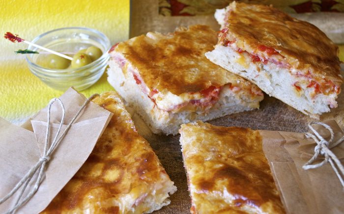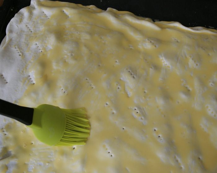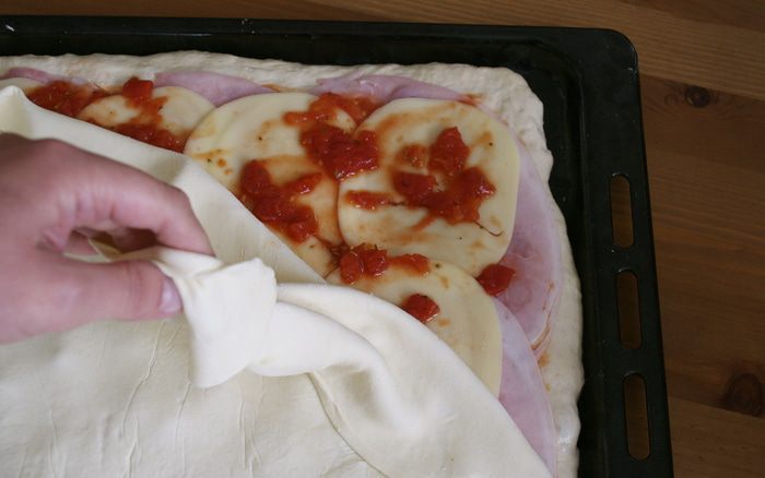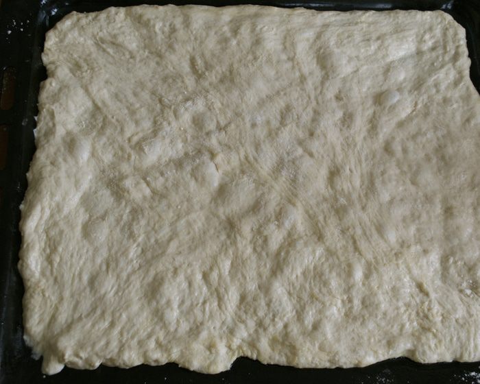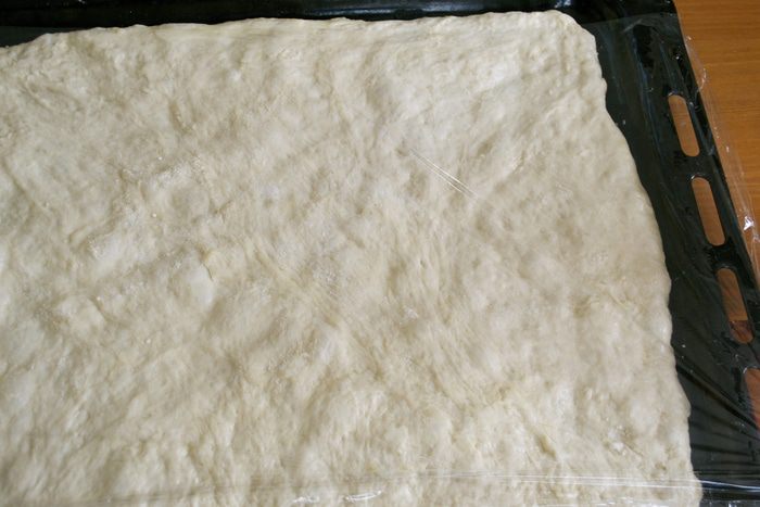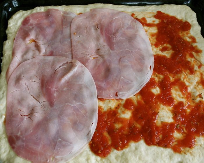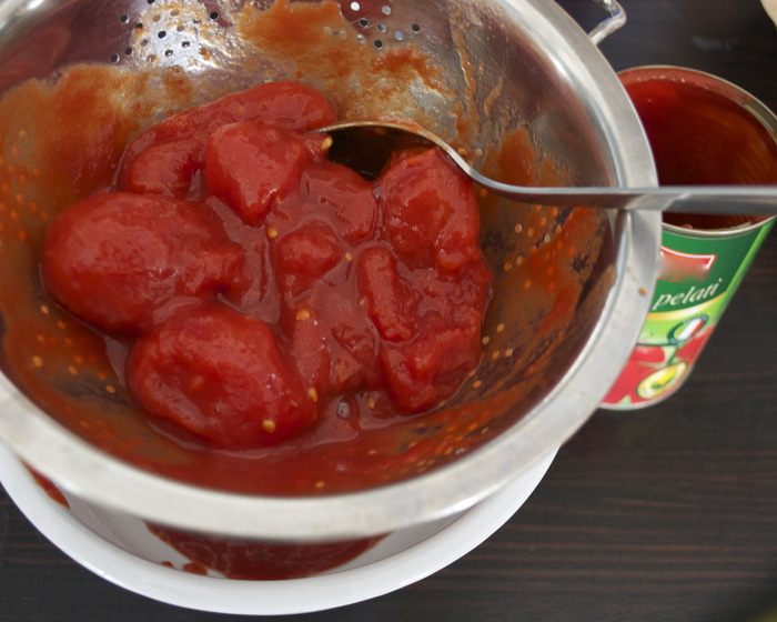 Тем временем, духовку включить разогреваться на 200 С. Помидоры в собственном соку выложить из банки в дуршлаг и дать стечь лишней жидкости (соку). ВАЖНО, постараться удалить как можно больше лишней жидкости, чтобы тесто пиццы не намокло. (Сок, естественно, не выбрасывать..., использовать для соусов, приготовления других блюд).