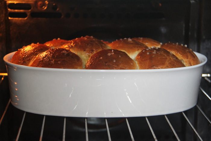 Для глазури смешать сливки и желток до однородного состояния. Смазать поверхность булочек сливочной глазурью. Присыпать крупной (!) морской солью.