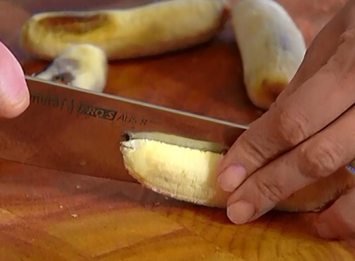 Бананы почистить и разрезать вдоль пополам.