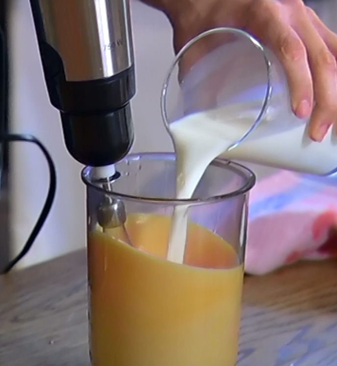 Не прекращая взбивать, влить молоко, всыпать оставшийся сахар, добавить сметану и взбить еще немного.