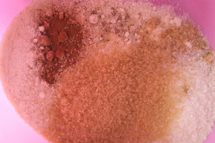 Смешать сухие составляющие: миндаль, сахар, корицу, мускатный орех, какао, разрыхлитель, муку.