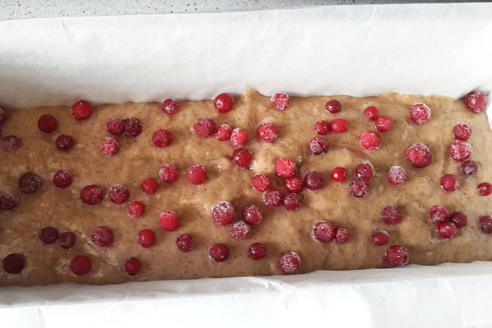 Вылить тесто в форму, устланную пергаментом. Сверху высыпать бруснику (не размораживать). Выпекать около 40 минут при 190°С.