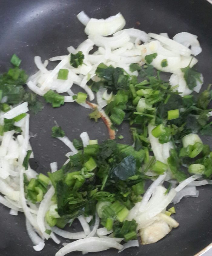 Добавляю зелень к луку.