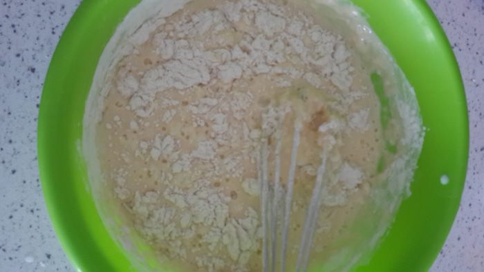 Всыпать муку и мешать очень хорошо, чтоб не было комочков.