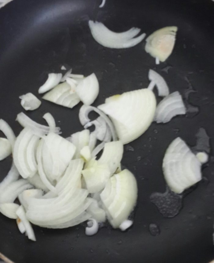Тем временем.... режем лук полукольцами и еще пополам и обжариваем на растительном масле.