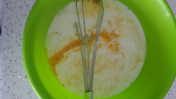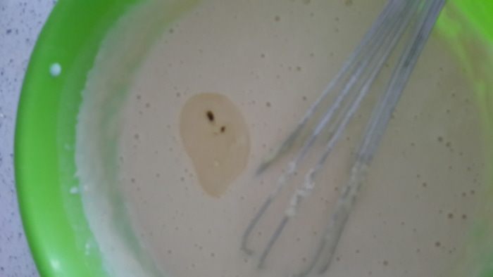 Влить ложу масла. И перемешать опять. Соду я не добавляю к айрану, он и так пузырится.