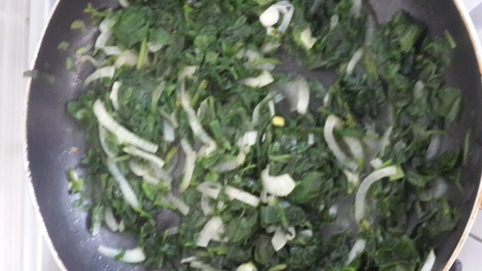 И шпинат. Помним, что шпинат очень быстро жарится и уменьшается в объеме. Шпинат можно посыпать сладким перцем, но не солить, так как сыр у меня солененький