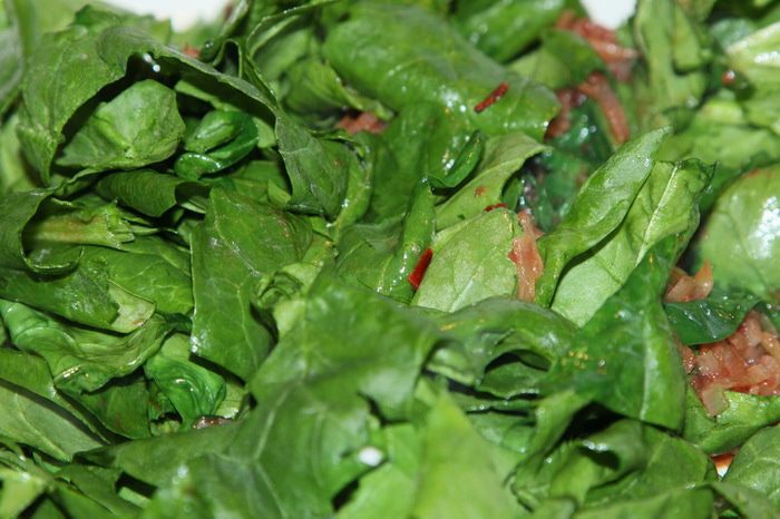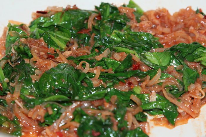Шпинат накрываем крупными кусками и отправляем в сковороду с соусом.