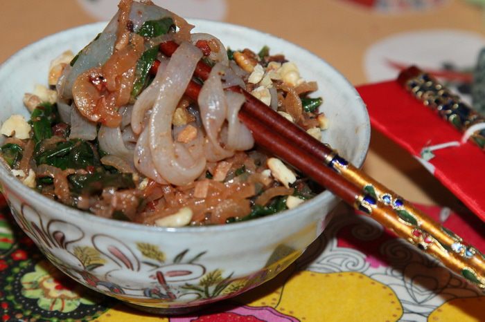 Выкладываем в пиалу нашу лапшу, посыпаем орехами и подаем.