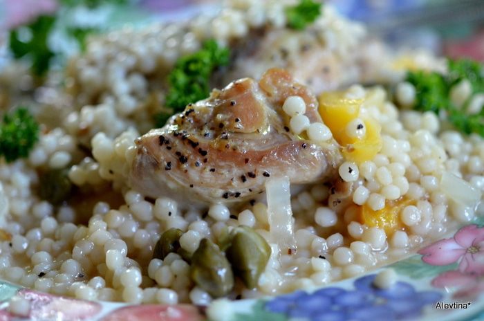 Добавить на сковороду порезанный лук, обжариваем примерно 4 мин. Добавим кускус, абрикосы без косточек, порезанные и каперсы. Все вместе обжариваем примерно 3 мин.