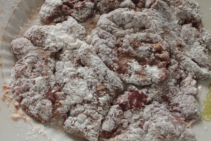 Каждую отбивную обвалять в муке, оставить на 1-2 минуты, что бы мука немного впиталась.