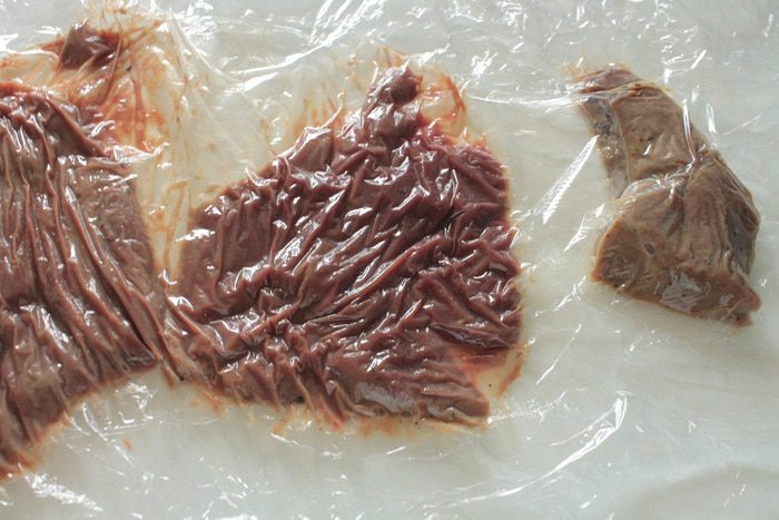 Достать печень из холодильника, отбить через пленку.