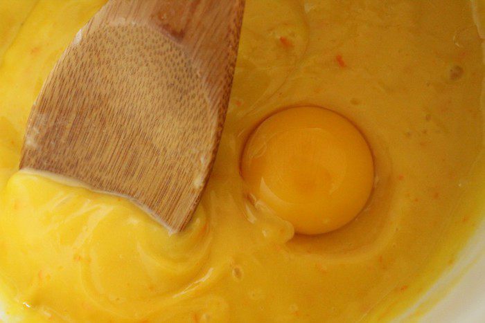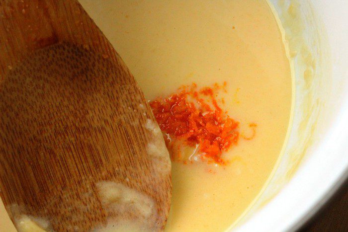 Снять с огня и постепенно ввести сок и цедру. Избавиться от комочков. Снова поставить на огонь и постоянно помешивая довести смесь до густого состояния.
