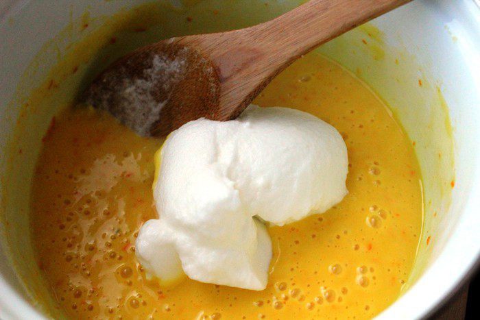 Частями ввести взбитые белки и аккуратно перемешать снизу вверх.