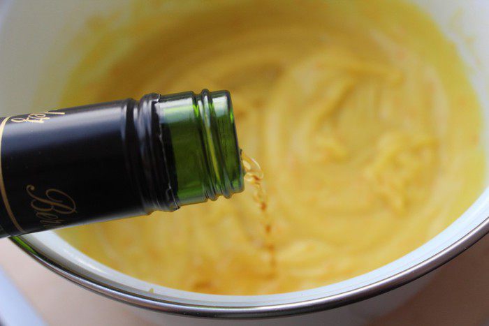 Влить темный ром. Ром можно заменить на любой апельсиновый ликер - Куантро́, Grand Marnier, Vana Tallinn. Все хорошо перемешать.