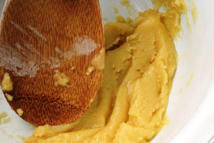 Постепенно добавить муку, перемешивая деревянной лопаткой.