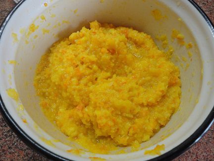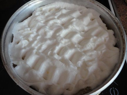Готовую основу из теста посыпать крахмалом и выложить лимонно-апельсиновую начинку, а сверху белки. При помощи силиконовой лопатки придать белками волнообразную форму (по желанию).