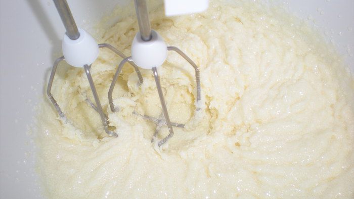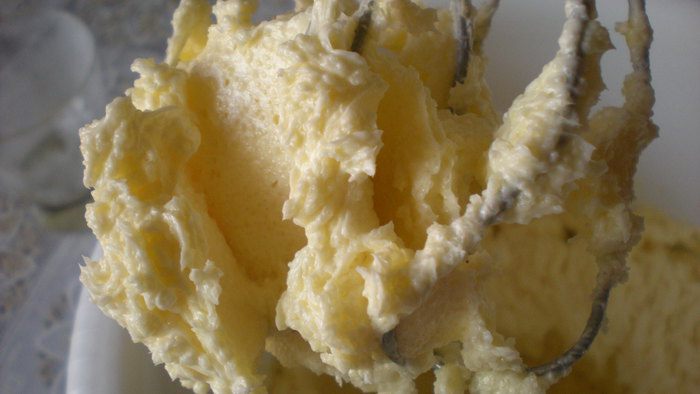 Соду добавить к сахарной массе, и туда же положить мягкое масло. Продолжить взбивать.