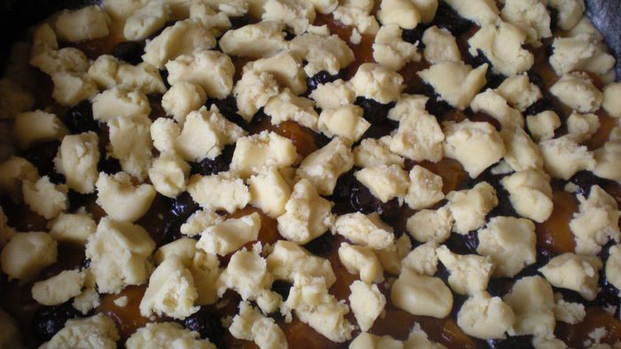 От второй части теста ощипываем кусочки и хаотично распределяем на ягоды. Ставим в духовку, предварительно нагретую до 200 градусов, на верхнюю полку. И выпекаем 40-50 минут.